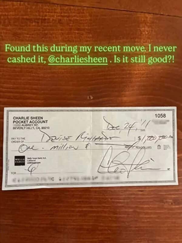 The actress showed proof👏 to her Instagram followers, sharing a photo of the uncashed check, tagging Sheen and adding the song “Money” by Pink Floyd.